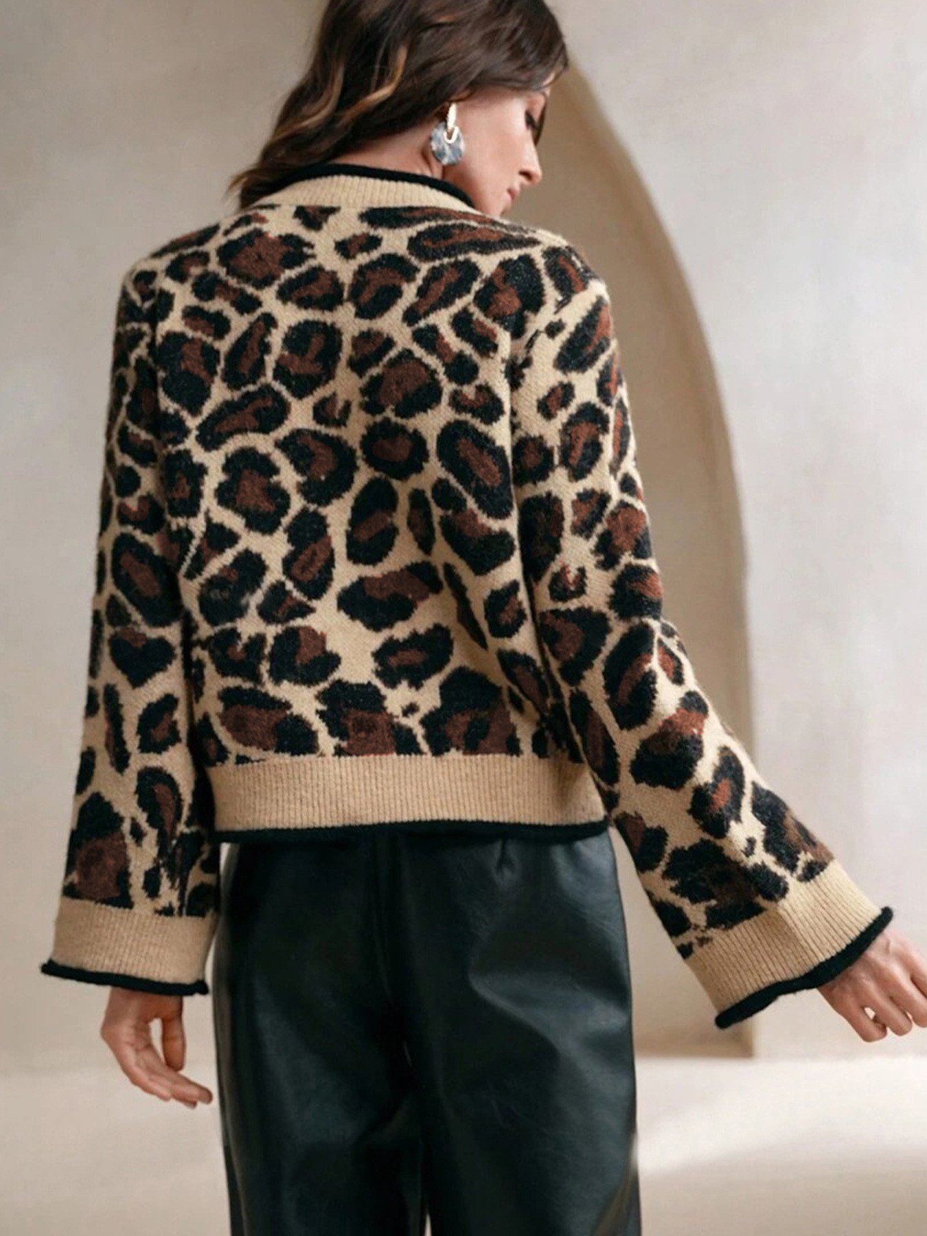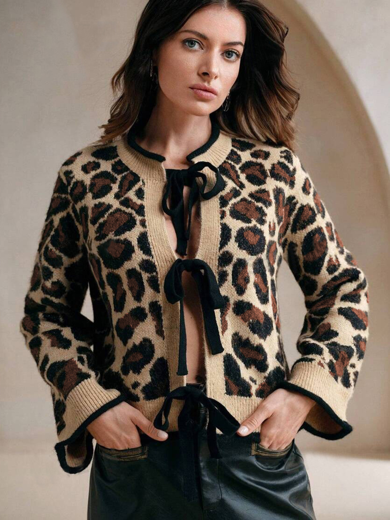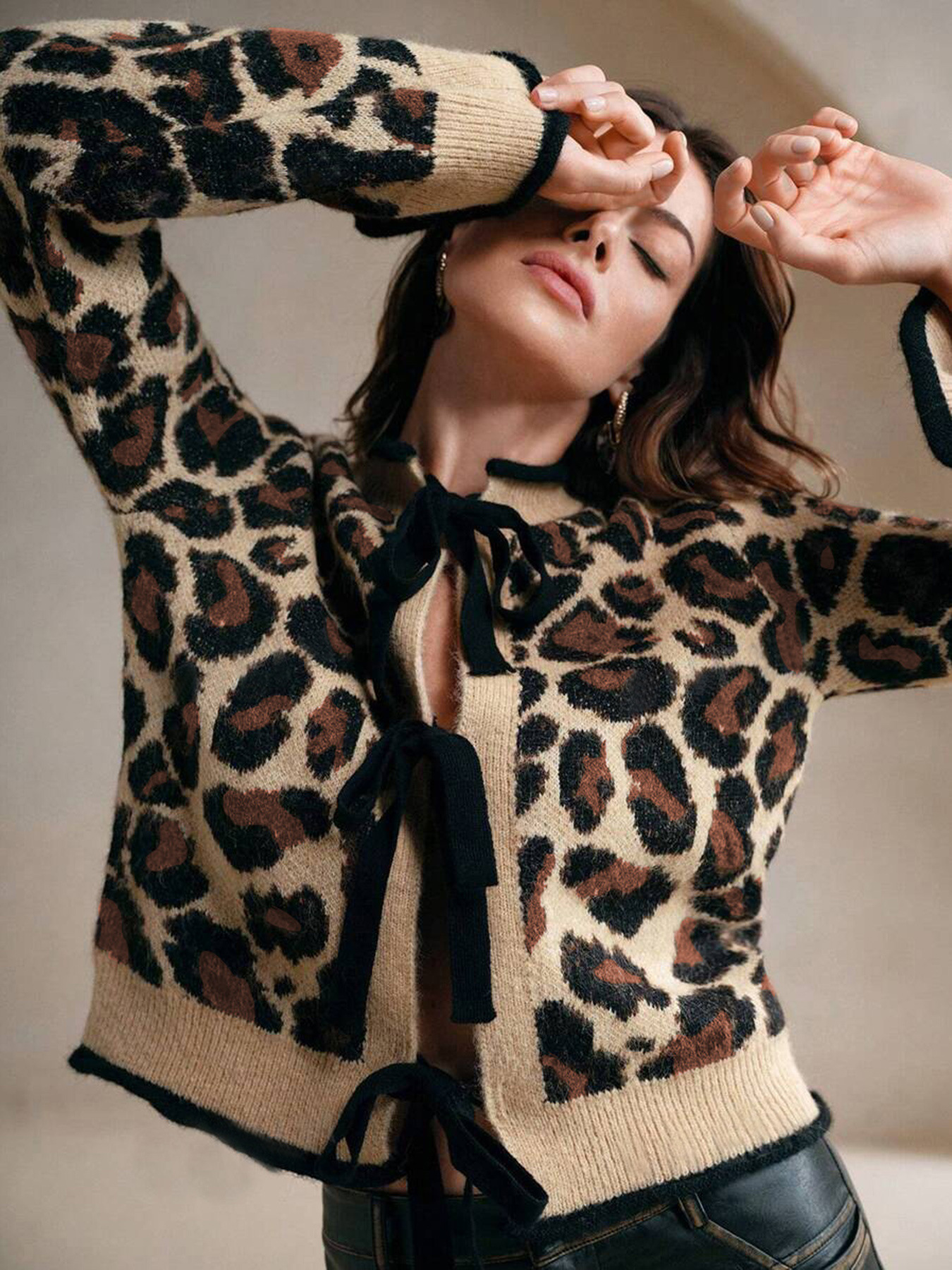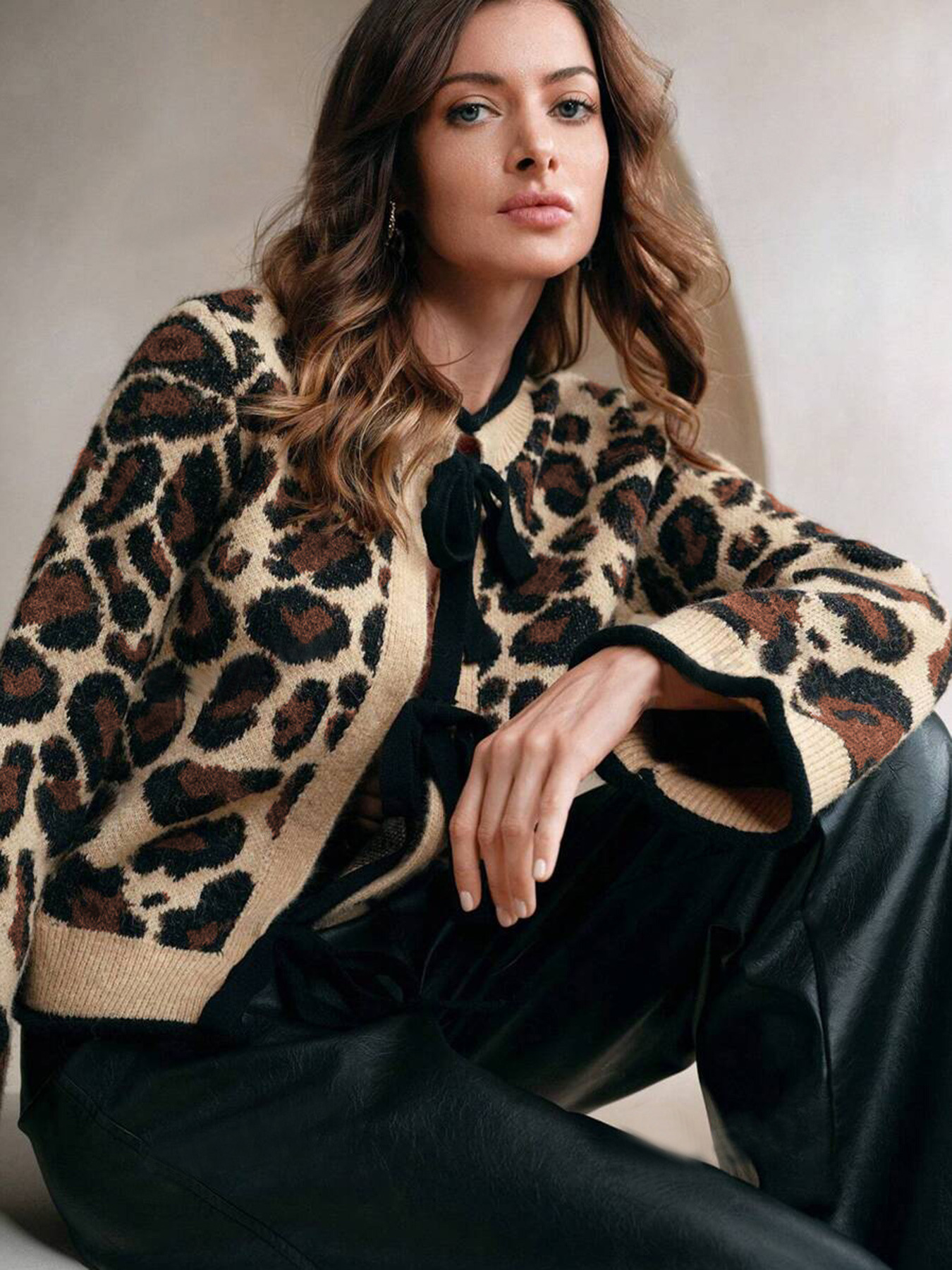 Ce cardigan offre une allure audacieuse tout en restant délicatement féminin. Son imprimé léopard intemporel, associé à des nœuds en tissu qui remplacent la fermeture traditionnelle, crée un style à la fois tendance et sophistiqué. Idéal pour sublimer une tenue simple et lui donner une touche de caractère.